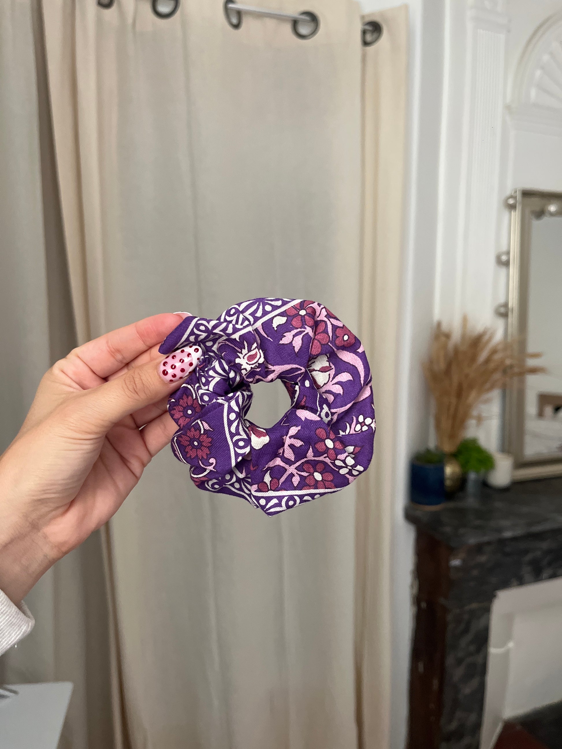 Ce chouchou est 100% fabriqué à la main, en utilisant des tissus de qualité qui garantissent durabilité et confort.