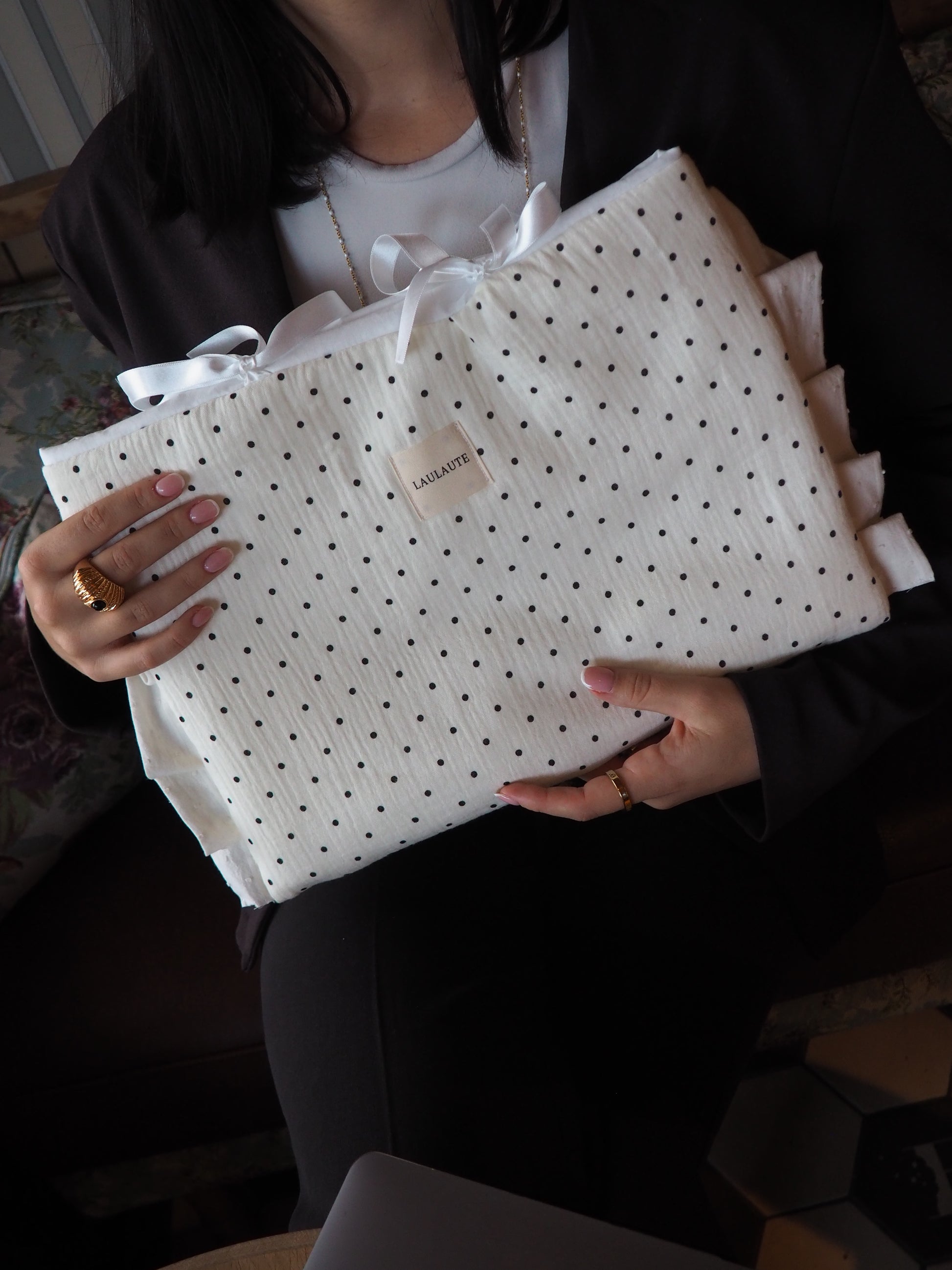 Entièrement doublée et délicatement matelassée, cette housse offre une protection douce et efficace à vos appareils tout en révélant le charme du fait main.