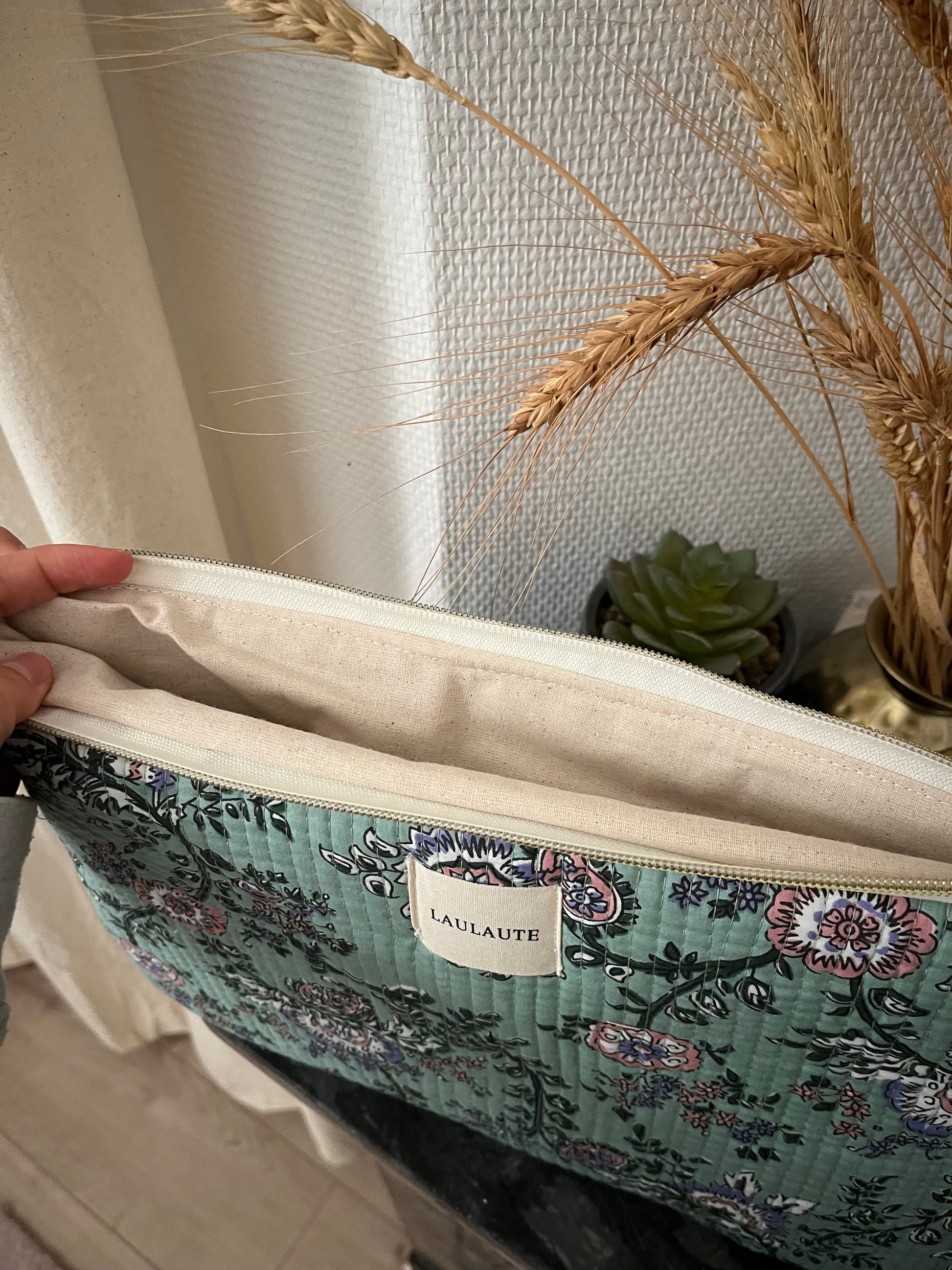 Entièrement doublée et délicatement matelassée, cette housse offre une protection douce et efficace à vos appareils tout en révélant le charme du fait main.