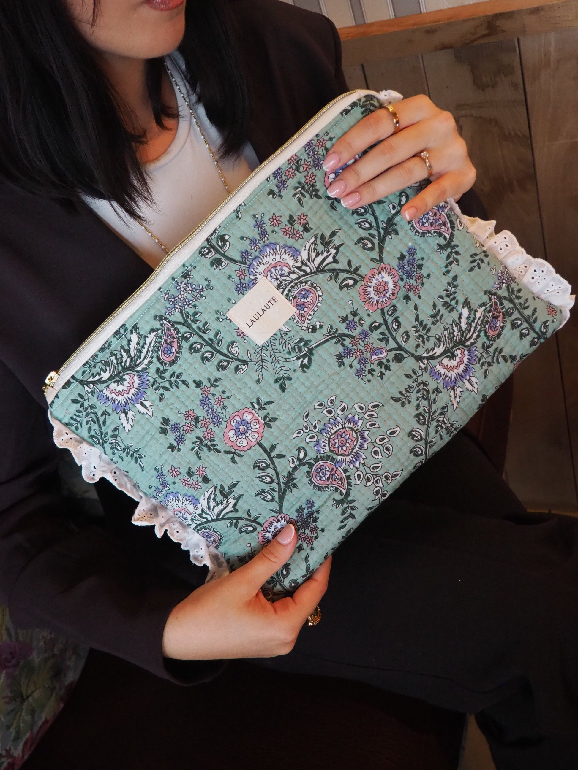 Entièrement doublée et délicatement matelassée, cette housse offre une protection douce et efficace à vos appareils tout en révélant le charme du fait main.
